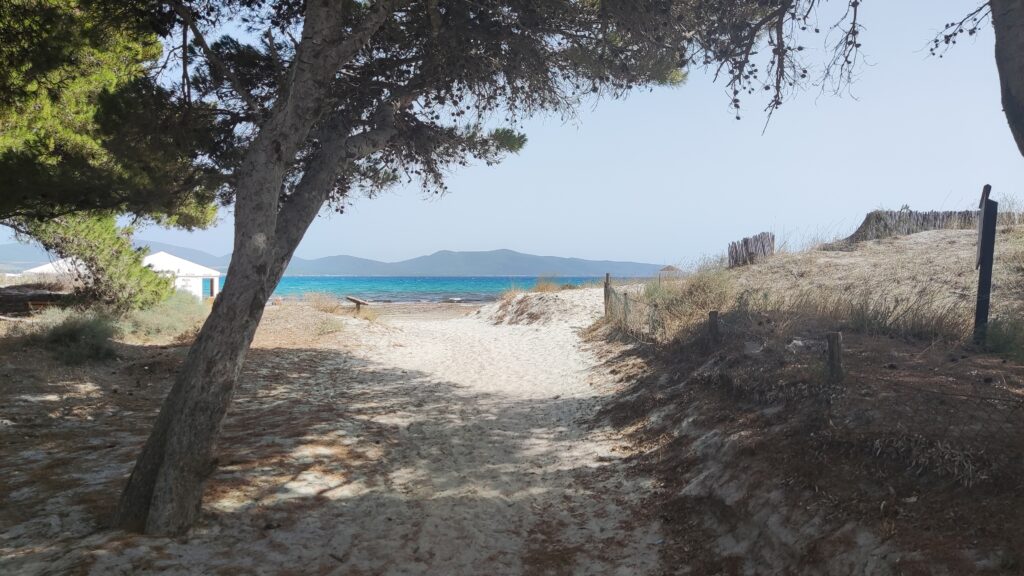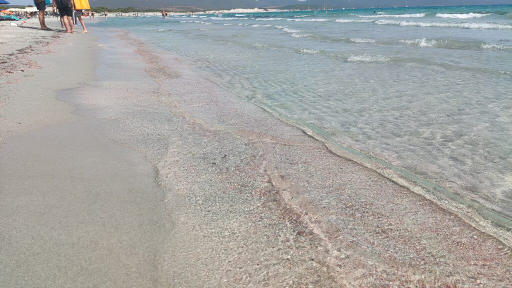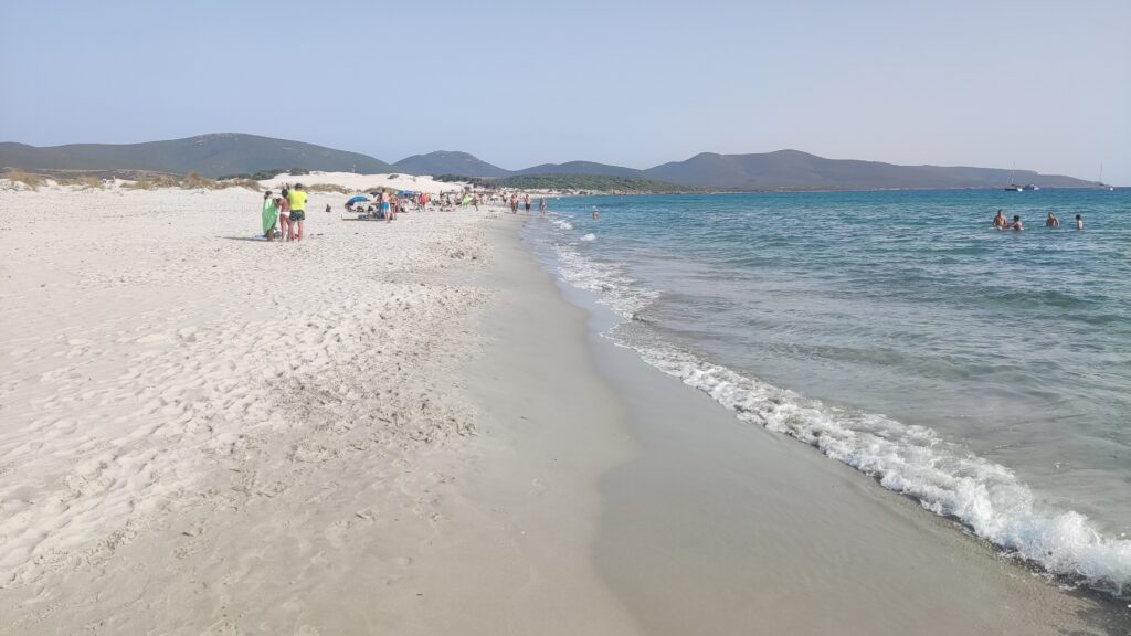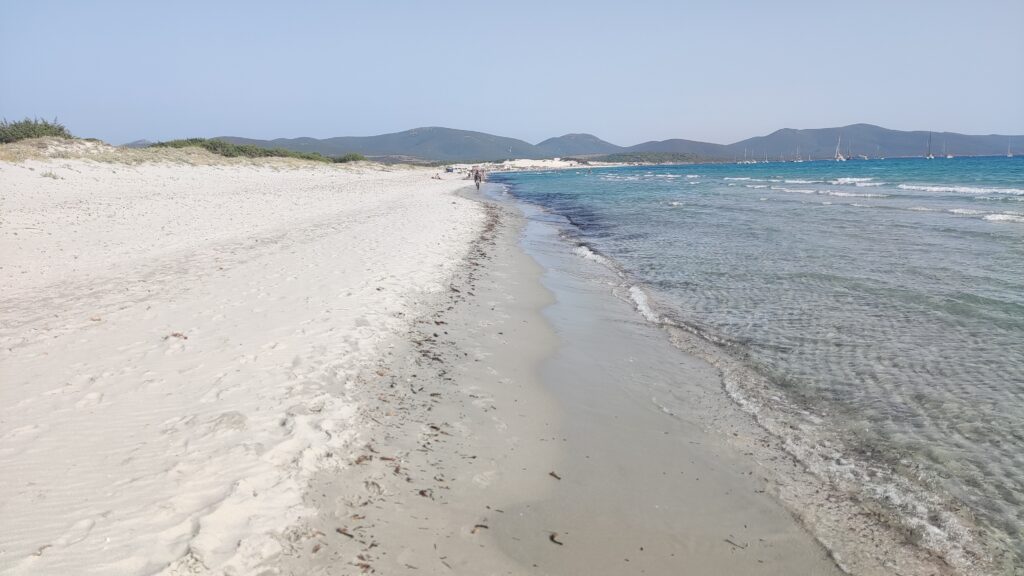 Pour le retour, on vise – environ à mi chemin – la petite citée balnéaire de Porto Pino. Et là c’est le choc. Une plage immense, au sable complètement blanc et très fin. Il y a pas mal de monde a proximité du parking, mais il suffit de marcher quelques minutes pour se trouver au calme et apprécier le site.